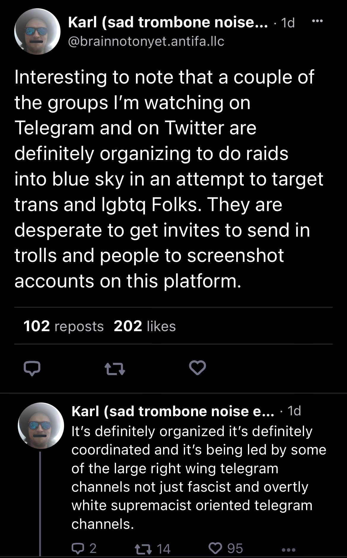 To me this is a clear sign that the lovely experience that everyone on Bluesky is having is describing as a twitter killer, will not continue to exist once it’s opened up. First off, all the weird fighty racists will make their way in, and again, I don’t think the people who made Bluesky have it in them to moderate the main instance very well. There are already people on Bluesky threatening to invite folks like the creator of Kiwifarms, and people outside of Bluesky frothing at the mouth for a chance to ruin the experience.